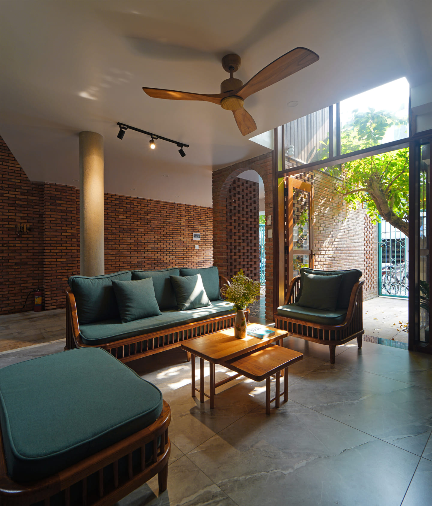 Thanks to the direction of air circulation along the length of the house, the space inside and outside of the house will become lively and cool. Both closed and open areas have wind movement throughout most of the day, making the best use of the natural source of energy.
